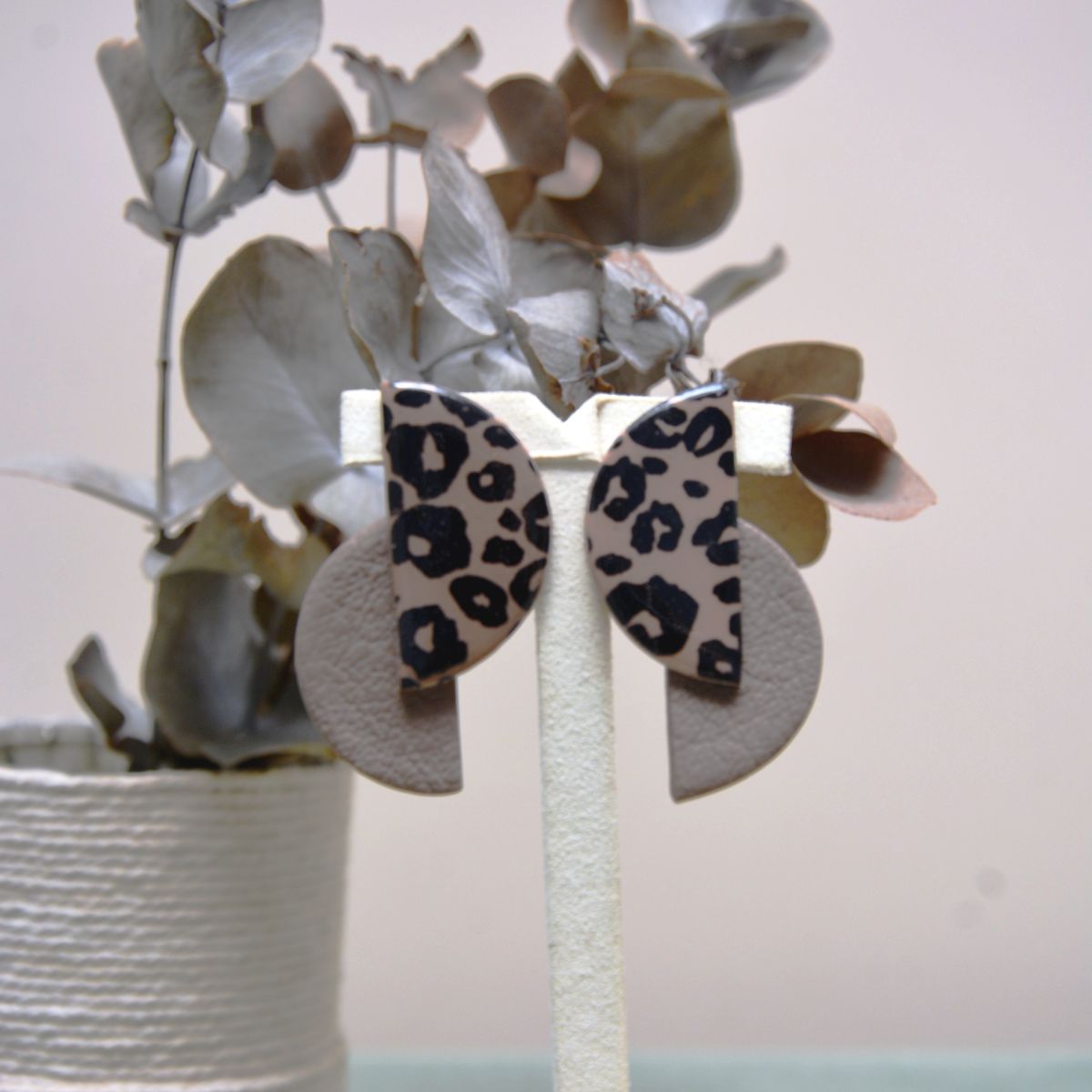 Chaque paire est façonnée avec minutie en argile polymère dans notre atelier, jouant avec la sophistication d’une demi-lune composée de deux univers complémentaires. La moitié lisse, teintée de taupe doux, se pare d’un rendu texturé subtil, rehaussé d’une fine couche de résine pour un éclat lumineux et une protection durable. À l’inverse, l’autre moitié arbore un motif léopard peint à la main, offrant un contraste audacieux et raffiné.