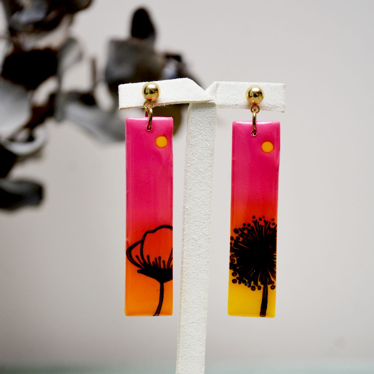 Boucles d’oreilles artisanales en argile polymère au dégradé rose, orange et jaune façon coucher de soleil. Décorées de motifs floraux noirs, recouvertes d’une fine résine brillante et montées sur acier inoxydable doré. Élégantes, légères et uniques.