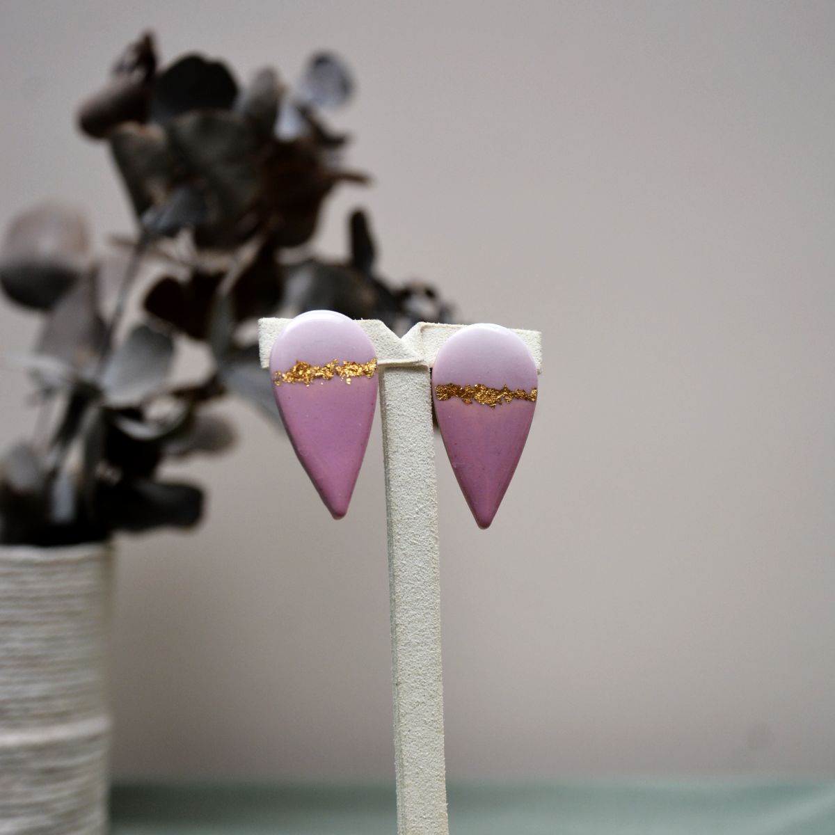 Boucles d’oreilles artisanales en argile polymère, en forme de goutte sur puce. Dégradé délicat de rose et blanc, agrémenté d’incrustations de feuille d’or, et protégé par une fine couche de résine brillante pour une finition précieuse et durable.