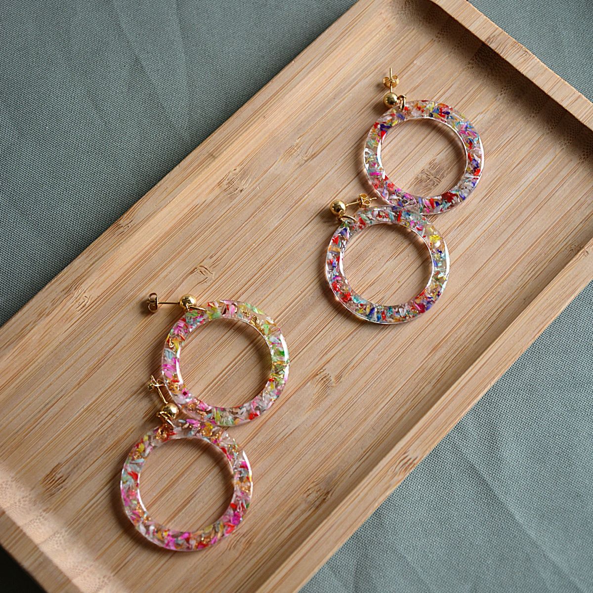Boucles d’oreilles artisanales en forme de ronde, incrustées de véritables pétales de fleurs d’immortelle multicolores dans de la résine transparente. Fait main avec soin dans les Hauts-de-France. Chaque paire est unique, les photos sont indicatives.