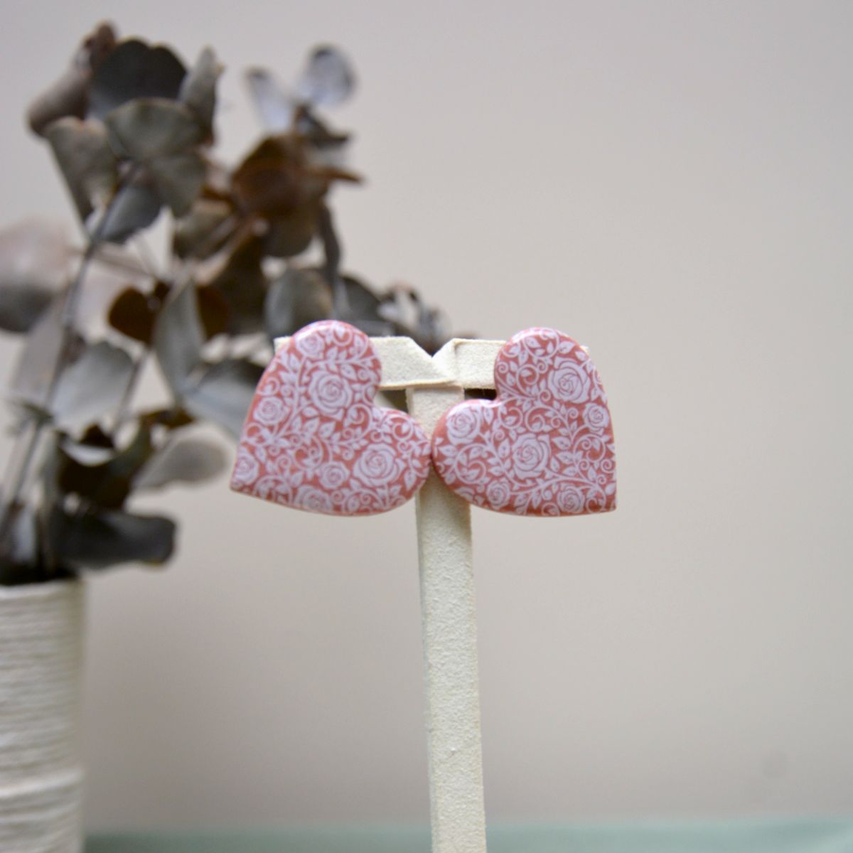 Boucles d’oreilles en forme de cœur, réalisées en argile polymère rose nacré avec un délicat effet pailleté. Chaque paire est unique : décorée soit du mot Love en noir, soit d’un motif rosier blanc. Une fine couche de résine apporte brillance et protection. Montées sur puces en acier inoxydable pour un confort durable.