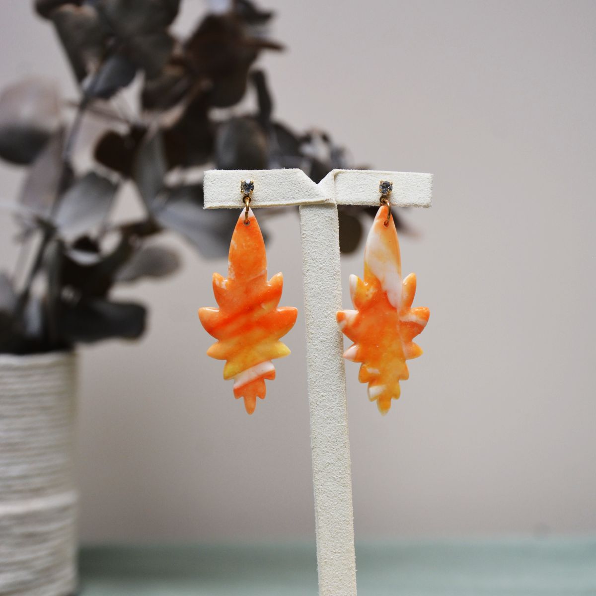 Boucles d’oreilles artisanales en forme de feuille, façonnées en argile polymère aux teintes marbrées orange et blanc. Une fine couche de résine brillante apporte éclat et protection. Élégantes, légères et uniques, elles subliment toutes vos tenues avec une touche naturelle et colorée.