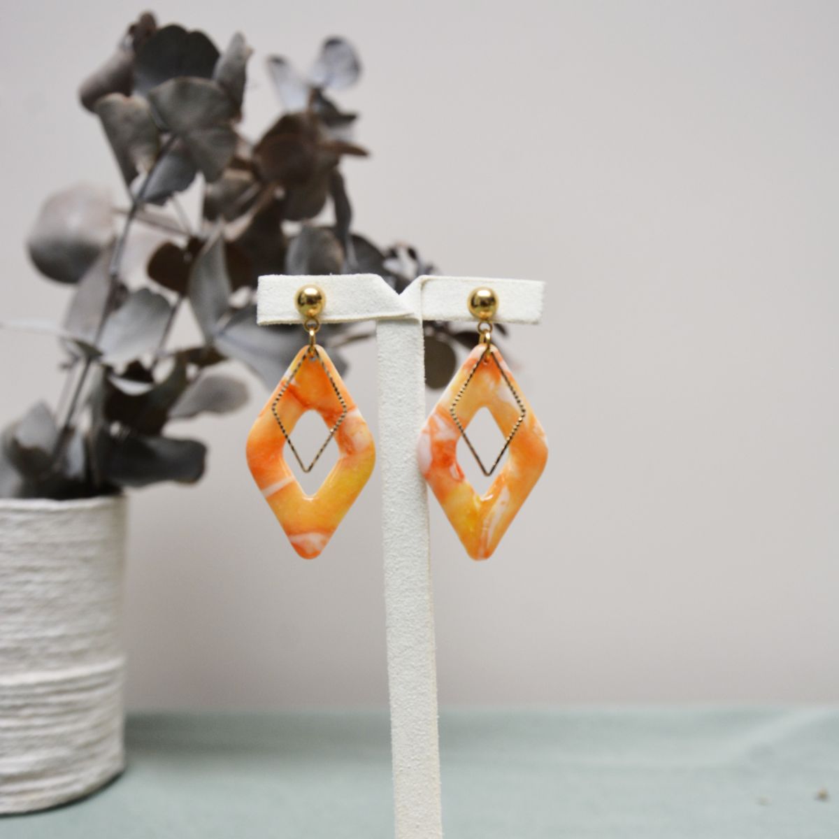 Élégantes boucles d’oreilles en forme de losange, façonnées à la main en argile polymère. Leur effet marbre orange et blanc unique est sublimé par une fine couche de résine brillante pour une finition éclatante. Légères et modernes, elles apportent une touche artisanale et colorée à toutes vos tenues.