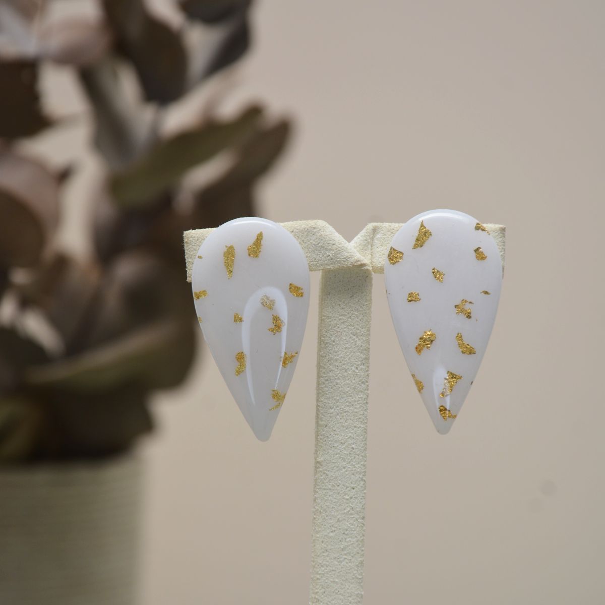 Laissez-vous séduire par la délicatesse de ces boucles d’oreilles puce en forme de goutte, entièrement façonnées à la main en argile polymère blanche. De fines incrustations de feuilles d’or apportent une touche précieuse et sophistiquée, sublimée par une fine couche de résine qui intensifie la brillance et assure une finition lisse et élégante.