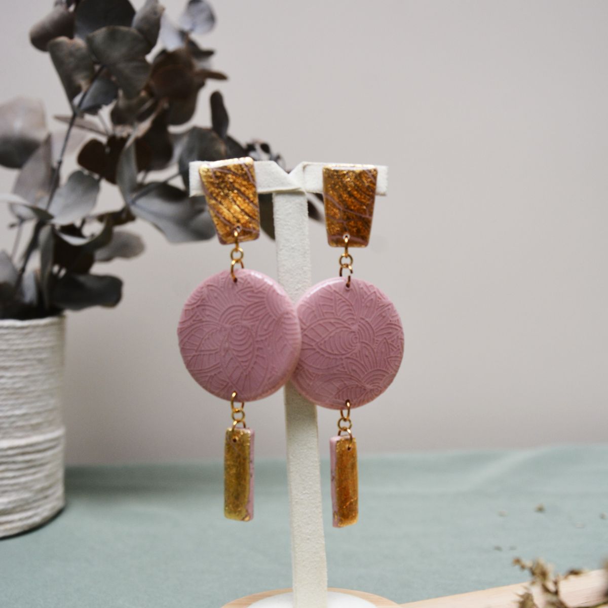 Boucles d’oreilles imposantes et élégantes en argile polymère, composées de trois éléments : une base géométrique décorée de feuille d’or montée sur puce inoxydable, un cercle texturé rose, et une pièce finale en argile polymère rehaussée de feuille d’or. Des bijoux uniques et lumineux pour celles qui aiment les grandes pièces artisanales.