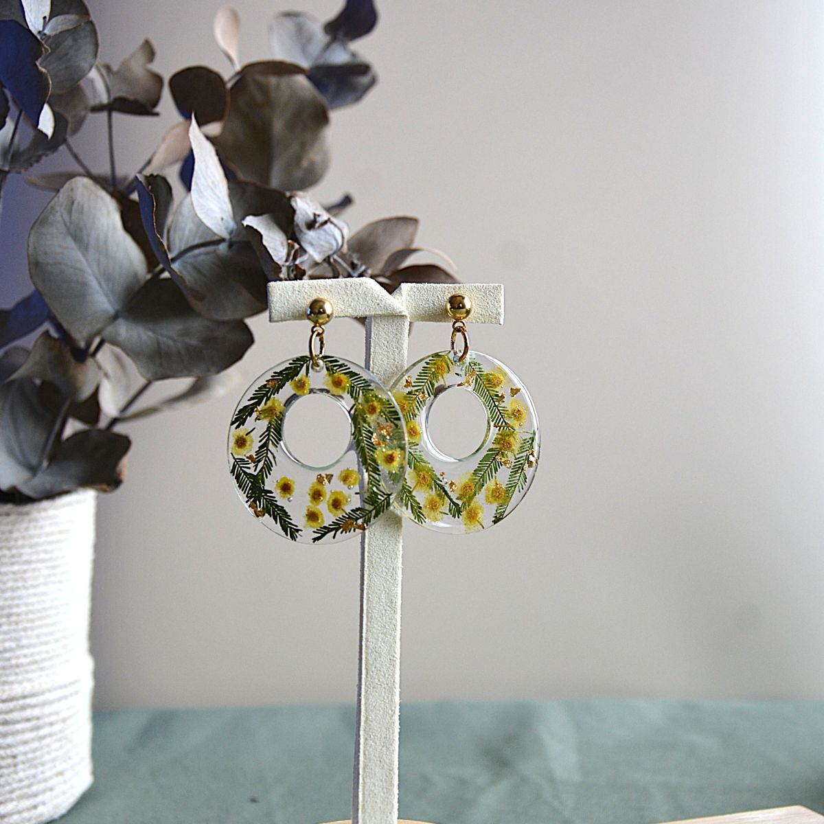 Boucles créoles en résine transparente, incrustées de véritables fleurs et feuilles de mimosa séchées à la main. Bijou artisanal lumineux et naturel.