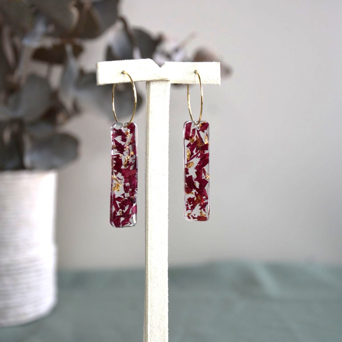 Fines créoles dorées avec pampilles rectangulaires en résine transparente, incrustées de pétales de rose rouge et de particules d’or. Bijou raffiné et unique.