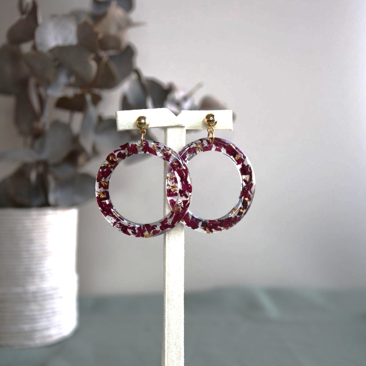 Boucles artisanales françaises avec pétales de rose rouge et feuille d’or incrustés dans la résine. Personnalisables avec vos fleurs séchées, mèches de cheveux ou poils d’animaux. Un bijou unique, chargé d’émotion, fait main en France.