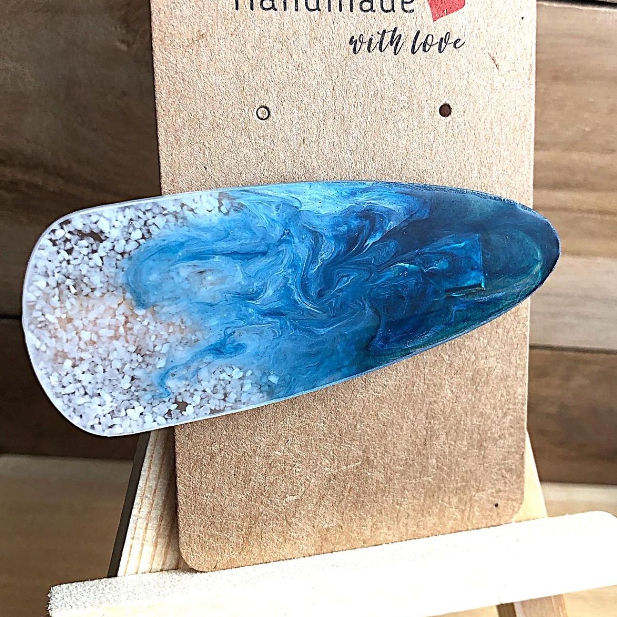 Réalisée avec une technique artisanale précise, cette barrette est constituée de résine colorée et de sable véritable. L’alliance de ces deux éléments crée un effet océanique saisissant, où les nuances de bleu profond et les textures sablonneuses se fondent harmonieusement. La résine transparente vient sublimer l’ensemble, apportant une brillance cristalline et une profondeur visuelle à la création.