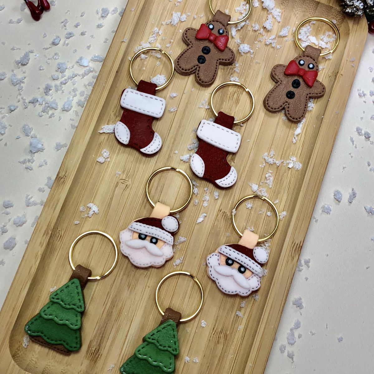 Ces charmants porte-clés de Noël faits main sont réalisés en argile polymère avec un effet cuir doux et raffiné, parfait pour apporter une note artisanale et chaleureuse à vos accessoires.